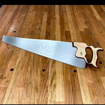 The Pax 26" Handsaw features a finely crafted blade made from a high quality alloy steel that is taper ground to prevent binding through the cut, all while giving the best and cleanest cut possible.PAX handsaws are one of the finest handsaws available today. Using the history and tradition of PAX, these saws are still made to original specifications. Handcrafted from the finest alloy steel these saws are taper ground and breasted (meaning less teeth are in contact with the wood and therefore less friction) and are precisely set and sharpened by hand to ensure the best possible cut without binding. The handle is made from the finest steamed beech with a two-tone gloss finish.With a variation of teeth sizes per inch, there is a Handsaw for every type of work and will give you a different type of cut/finish depending on what you require.* Our standard Rip saws have 4 tpi are intended for cutting down the grain.* A Standard Handsaw has 8tpi and is a crosscut saw for cutting across the grain. This is a good general purpose tooth size.* The Panel Saw has 10tpi and is a finer toothed crosscut saws. It is for cutting across the grain and gives a finer finish than larger toothed handsaws. The Pax Handsaws have the following key features: * Two Tone Traditional Beech Handles with gold leaf embellishment* Solid Brass Screws Medallions* Hand Sharpened in production* Taper Ground and have a breasted tooth line. Offers premium capability in terms of reducing friction and any binding during cutting.* Laser marked with PAX logo.* Can be re-sharpened