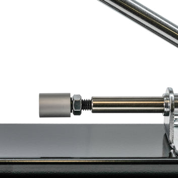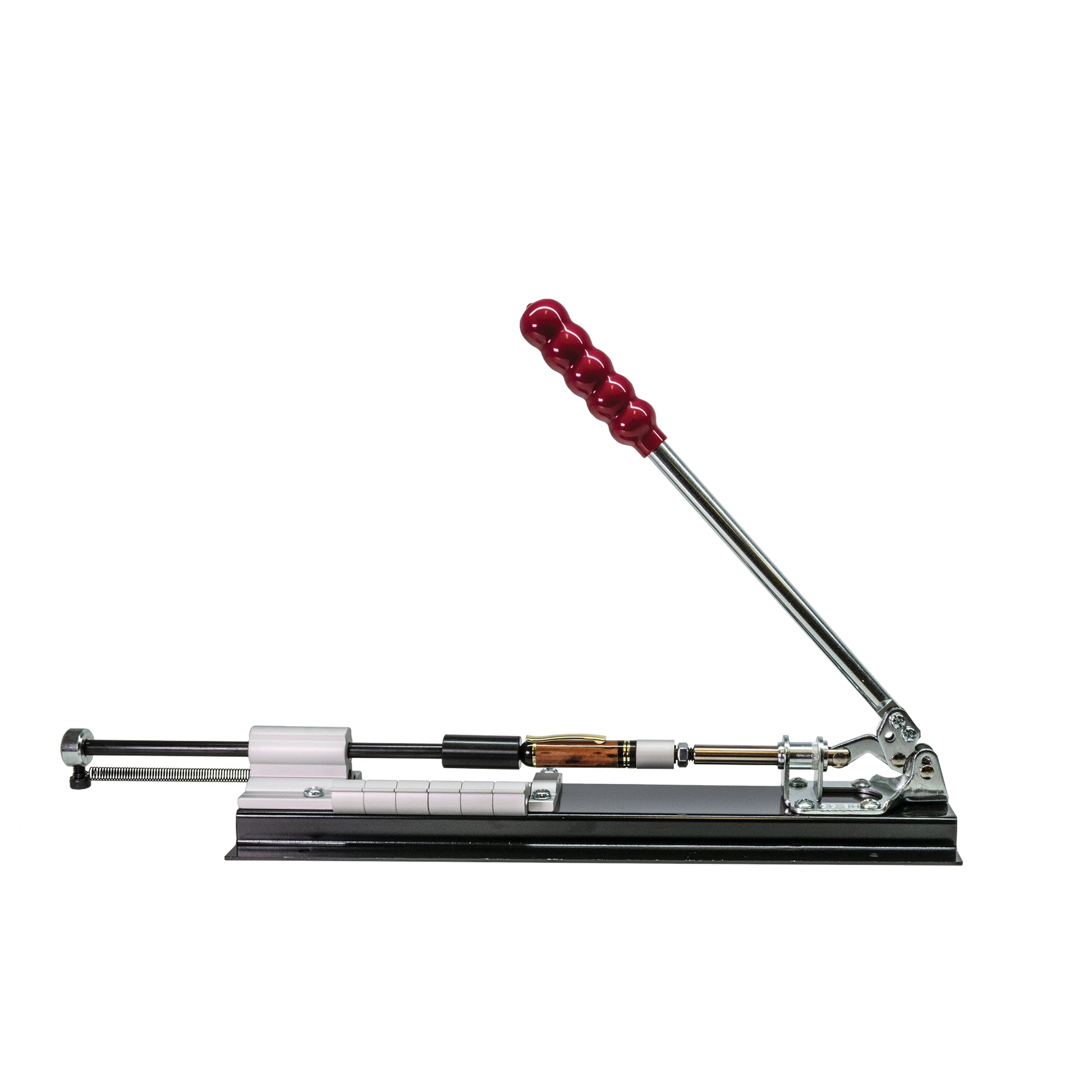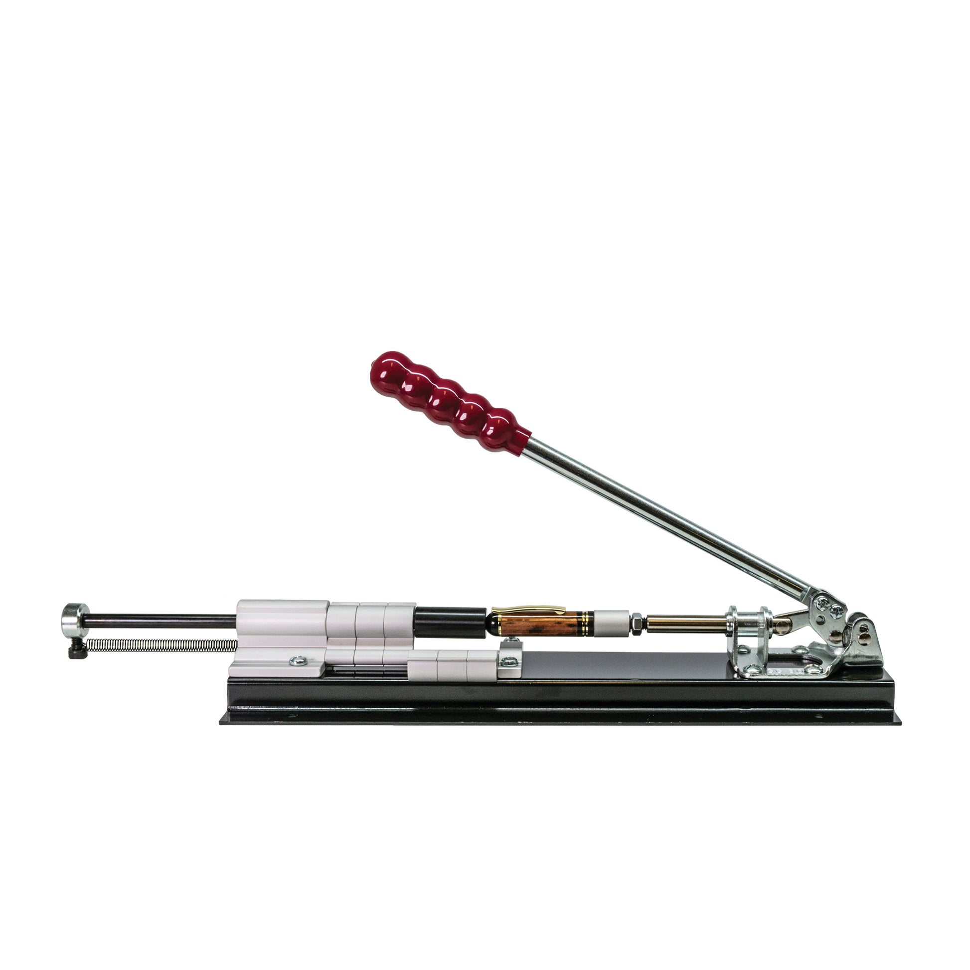 A new and improved way for assembling your pen parts. Simply flip the spacers out of the way and bring back the spring-loaded mandrel for the length of the components into the position. The self retracting mandrel will then apply enough pressure to help holding the components together up against micro-adjustable press jaw. No more screw/unscrew knobs for length adjustments. KEY FEATURES: - Steel handle and pivots deliver up to 300 pounds(136 kg) of pressure - Quick-flip spacers allow pressing different lengths up to 146 mm - Spring-loaded, self-retracting mandrel - Micro adjustable jaw - Easy-to-clamp wide base flange - Large ergonomic handle