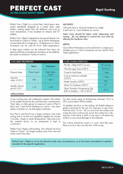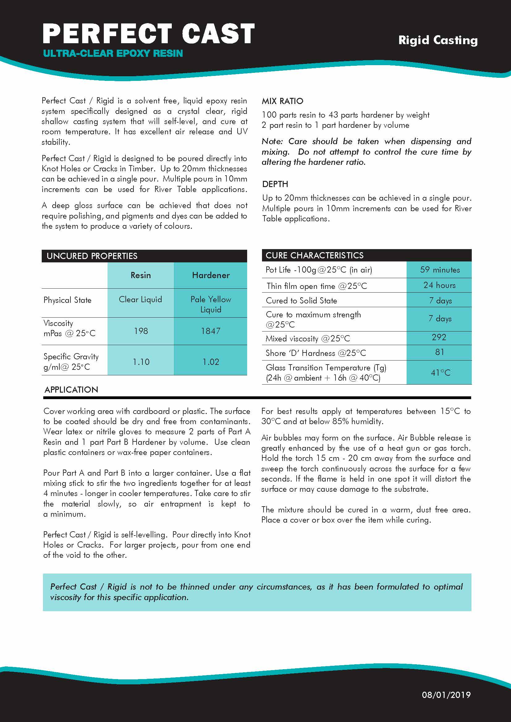 Perfect Cast / Rigid is a solvent free, liquid epoxy resin system specifically designed as a crystal clear, high-gloss rigid casting system that will self-level. and cure at room temperature.Kit contains 4 litres of Resin and 2 litres of Hardener. Perfect for River Tables.