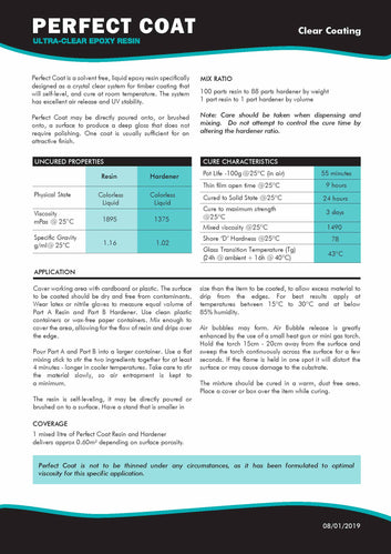 Perfect Coat is a solvent free, liquid epoxy resin specifically designed as a crystal clear, high-gloss coating system for timber coating that will self-level, and cure at room temperature.Kit contains 2 litres of Resin and 2 litres of HardenerMixing resins by weight is a lot more accurate than by trying to mix it by volume. This is done using digital scales; place a clean mixing container onto the scales and zero it. Pour in the required amount of part 1, take the weight and multiply by 0.88. Zero the scales and pour in part 2 COATING 1:1 by volume / 1:0.88 by weight