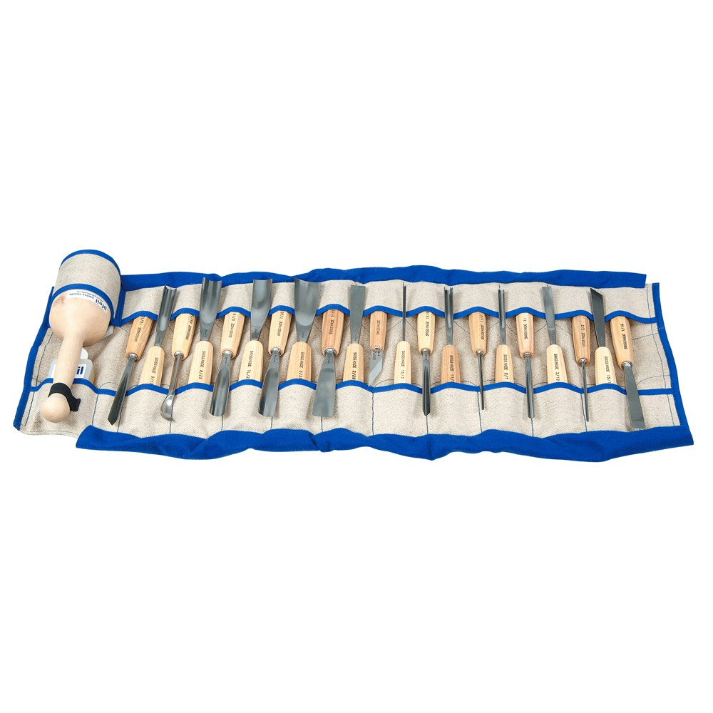 A complete set of 25 tools that includes: one 80mm wooden mallet; two genuine Arkansas sharpening stones; honing oil; Brienz carving knife; 20 woodcarving tools.Woodcarving tool profiles include the following sizes: 1-16; 1S-16; 2-20; 3-3; 3-12; 3-25; 5-35; 7-20; 8-7; 8-18; 8-25; 9-7; 8A-18; 9-15; 7L-25; 11-2; 11-10; 15-3; 12-10; 14-8.Roll also available separately.