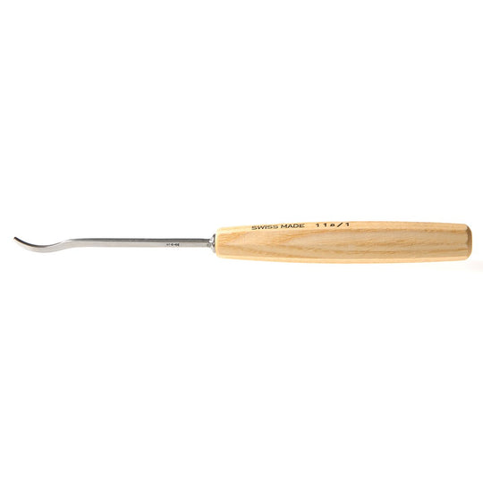 Pfeil Number 11A Bent Spoon Chisels are a deeper gouge with a straight shaft, and bent blade, used for cutting recesses and rounded surfaces.