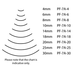 The No. 7A is a spoon bent; deep gouge available in a number if different cutting widths. Swiss made Pfeil chisels come sharpened and are completely ready for use. They are constructed with chrome vanadium alloy that is made to Pfeil's own specifications. Profiles shown include a suffix that indicates profile width (eg. -2 = 2mm width).