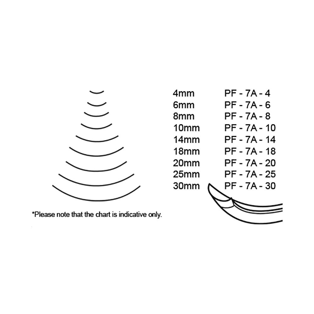 The No. 7A is a spoon bent; deep gouge available in a number if different cutting widths. Swiss made Pfeil chisels come sharpened and are completely ready for use. They are constructed with chrome vanadium alloy that is made to Pfeil's own specifications. Profiles shown include a suffix that indicates profile width (eg. -2 = 2mm width).