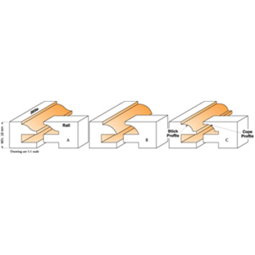 CMT rail and stile sets are a perfect pair. Made to match exactly; not approximately like standard reversible cutters. Create smooth; perfect joints in hard and soft woods with accuracy and speed. Perfect for stock thickness from 18 to 22mm.Example A of A, B and C