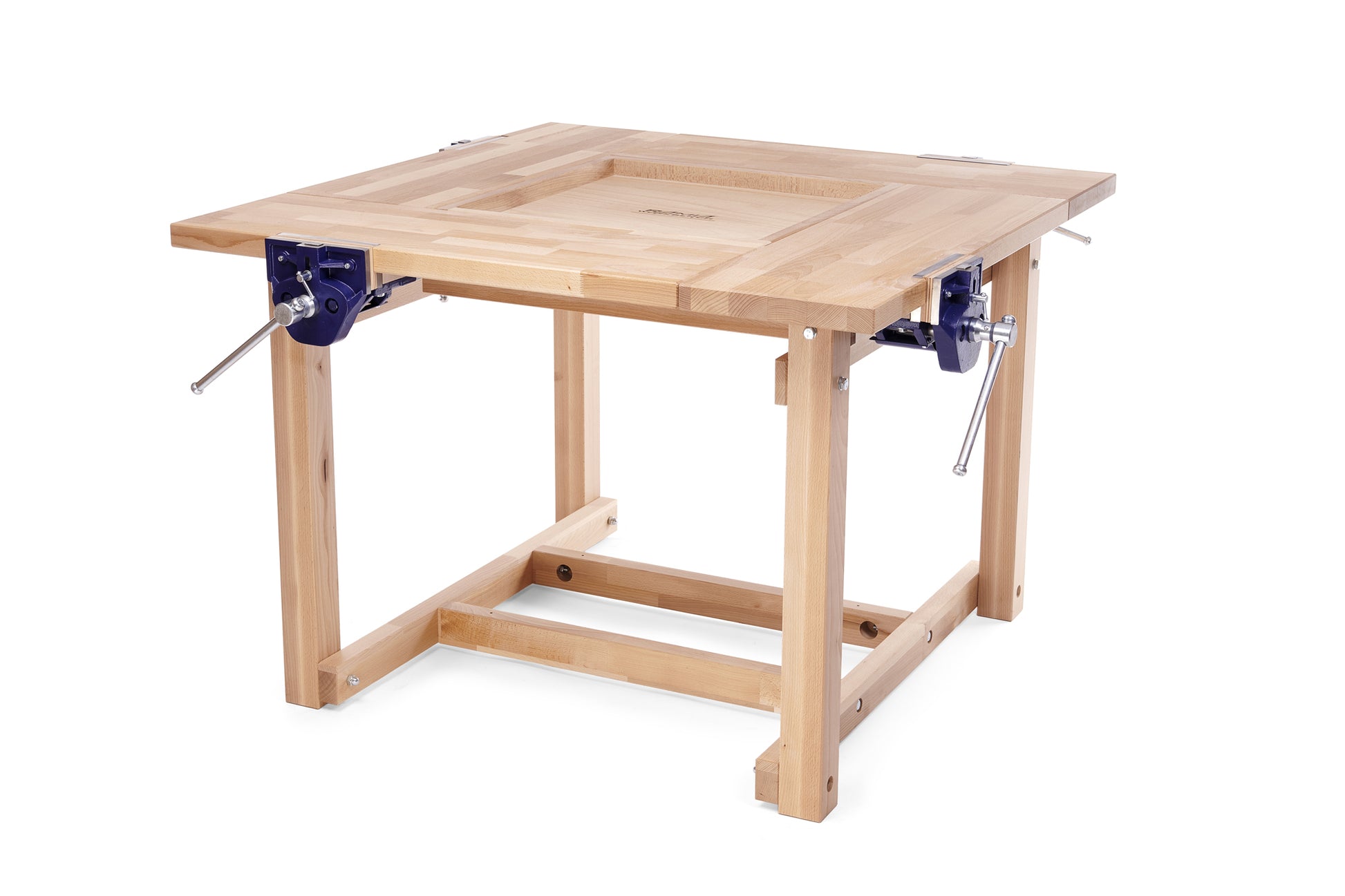 This 1200 mm square worktop is great for introducing students to woodworking. The timber-jawed, metal woodworking vices are robust enough for new woodworkers but wont damage their work. Sturdy timber legs provide a stable base for this workbench. Adjustable steel legs and locking storage cupboards are available separately.