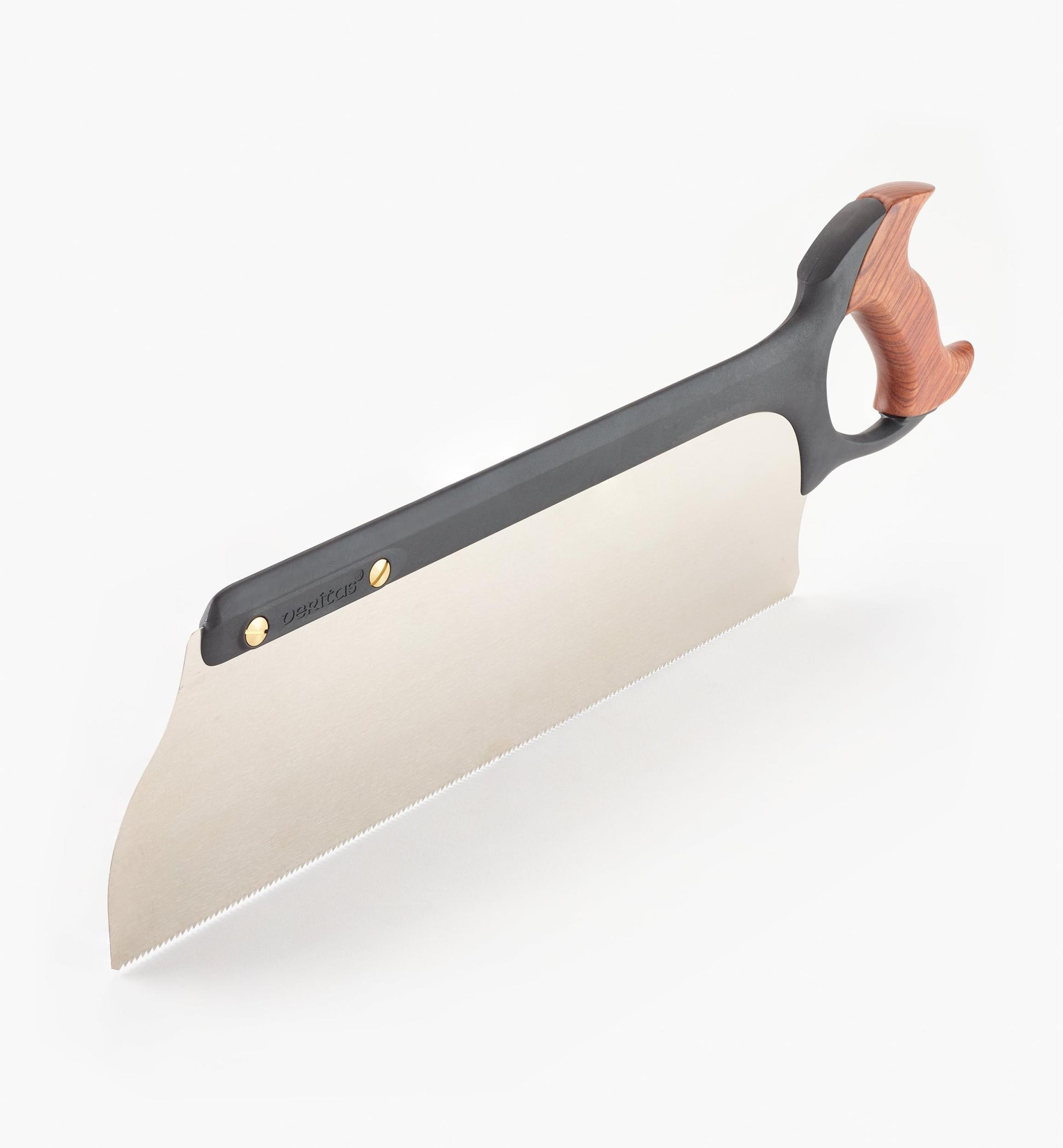 Veritas Tenon SawsWeighing just under 1 1/2 lb (650 grams) with 16" (406mm) blades, these are the largest saws in the Veritas line. This is the 9 tpi rip saw, but they are also available in 12 tpi crosscut style. The blades are made from 0.024" (0.6mm) thick high-carbon steel with 0.003" (0.076mm) of set per side and a cut depth of nearly 4" (100mm). The teeth on the rip saw have a 14° rake angle.Each saw is well balanced, with a spine molded from a mixture of stainless-steel powder for weight, glass fiber for stiffness and a polymer resin binder. The closed handle is configured for exceptional control for a saw of this size and weight, with a hardwood grip secured by a stainless-steel bolt and brass nut.The blade and handle-mounting bolt are molded into the spine, creating a solid blade/spine/mount assembly.Made in Canada.