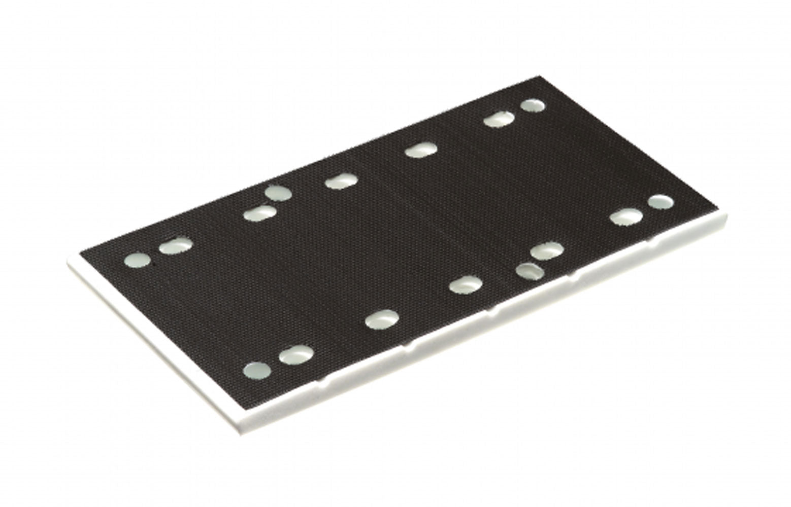 Soft pad for consistent sanding results on broad, flat surfaces such as sheet goods with thin veneers or solid wood panels. This 115 mm x 221 mm Sanding Pad has StickFix hook and loop design for quick and efficient abrasive changes. This enables re use of partially used abrasives. Turbo dust extraction maximizes dust removal, and helps the tool run cooler, extending pad and abrasive life.