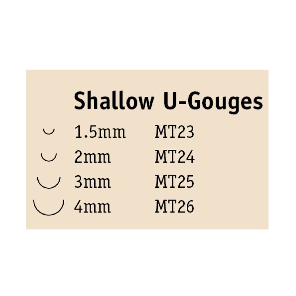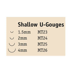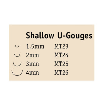Our Micro Tools can handle the extra-fine details often encountered in woodcarving. This set features four micro shallow U-gouges. Micro Tools included: MT23 - 1.5mm, MT24 - 2.0mm, MT25 - 3.0mm, MT26 - 4.0mm. Perfect For: Miniature and fine detail work, Cleaning up ridges created by gouge cuts, Cleaning up tight corners, Accessing tight spaces, Carving fine details such as mouths and eyes, plus adding texture such as hair, fur and feathers.