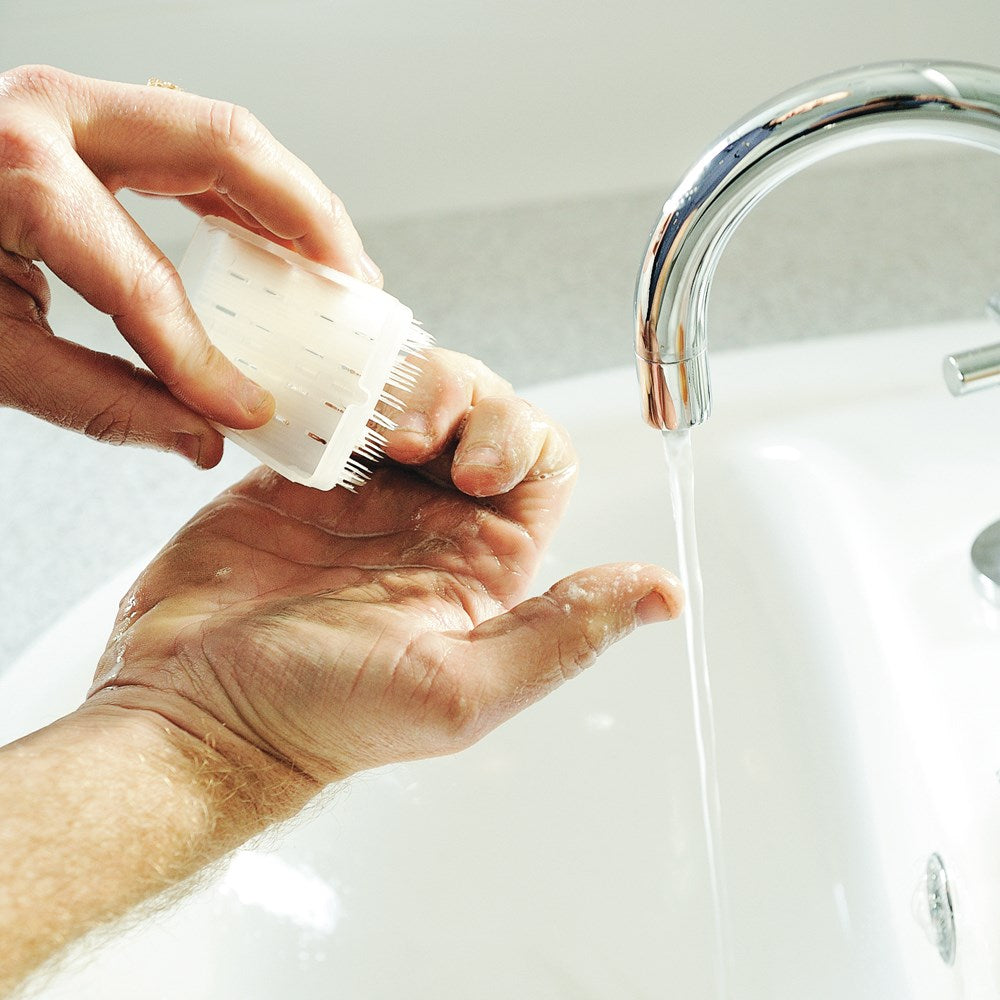 This nylon brush is intended for use directly on skin and is gentle but very effective at removing dirt from your hands under your fingernails. It measures 50 x 75mm and has 1440 individual bristles. Made in USA.