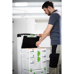 The Festool SYS-ROLL Mobile Cart for Systainer easily transports Systainers of any size and Sortainers, on 2 swivel castors and two 200mm diameter fixed wheels. With these castors being lockable, it can be locked making steering easy. The safety strap ensures the Systainers will stay in place during transportation. With a weight rating of 100Kg, moving your tools around is now so much easier.Included: