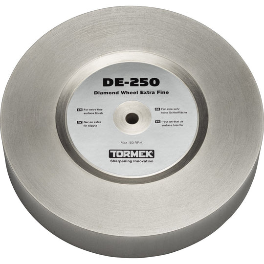 The extra fine diamond wheel from Tormek has a grit equivalent of 1200, will give you an extra fine finish ideal for carving tools and kitchen knives when the need for removing steel is minimal. Materials such as steel, ceramic and carbide can be sharpened using the new diamond stone range, and can be mounted to the current T-8 model, previous T-7 model and earlier models that use a 250ml diameter wheel. The diamond stones give the same grind as the water stones using the outside edge, without the need to truing and as a result will not reduce in diameter, with the added benefit of being able to sharpen using the face of the wheel and achieving a flat grind previously not possible with the water stones, using the new MB-100 Multi Base.Included with every wheel is a 150ml bottle of anti-corrosion concentrate to prevent rust forming on the grinding wheel, use this in a 10ml to 250ml ratio.