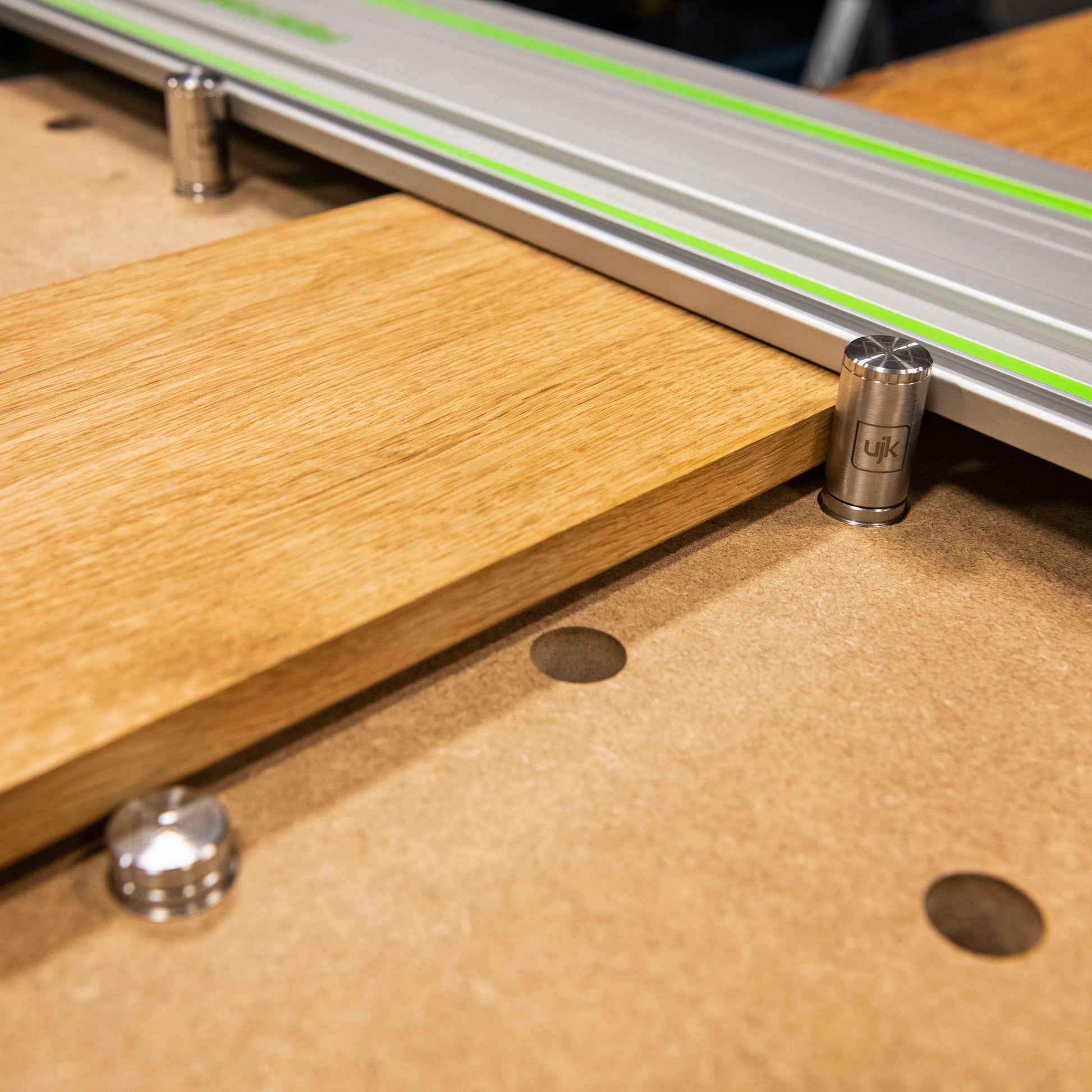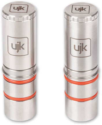 UJK Expanding Dogs are effectively shorter and slightly simpler versions of the UJK Super Dog. They feature the same locking mechanism as the UJK Super Dog. CNC machined from 303 stainless steel in our own workshops in Axminster, the UJK Expanding Dogs maintain our high quality for precision engineered products.These dogs are engineered to fit into a 20mm dog hole. They Expand the possibilities and uses on any workbench with 20mm dog holes. Theyre fully compatible with the UJK Multifunction Workbench and Festool Multi-functional MFT/3 Table. The locking mechanism is designed to take up any slight tolerance there might be in the dog hole itself. A simple twist of the top of the dog changes fine tolerance into zero tolerance and locks it firmly in place. Once locked the Expanding Dog will sit perfectly still, without any wobble or movement. Supplied with the unique chafer ring, this feature ensures the dog sits in the hole and provides a register ensuring the dog sits exactly at 90 to the work surface when locked in place, whilst still allowing for a flush fit, the chamfer ring also stops the dog falling through the hole before it's adjusted. A UJK Chamfer Cutter is available for other non chamfered tables, or you can use a router with a bevel cutter to create a slight chamfer.These Expanding Dogs are supplied as a pair and have a 40mm projection above the surface of your bench.