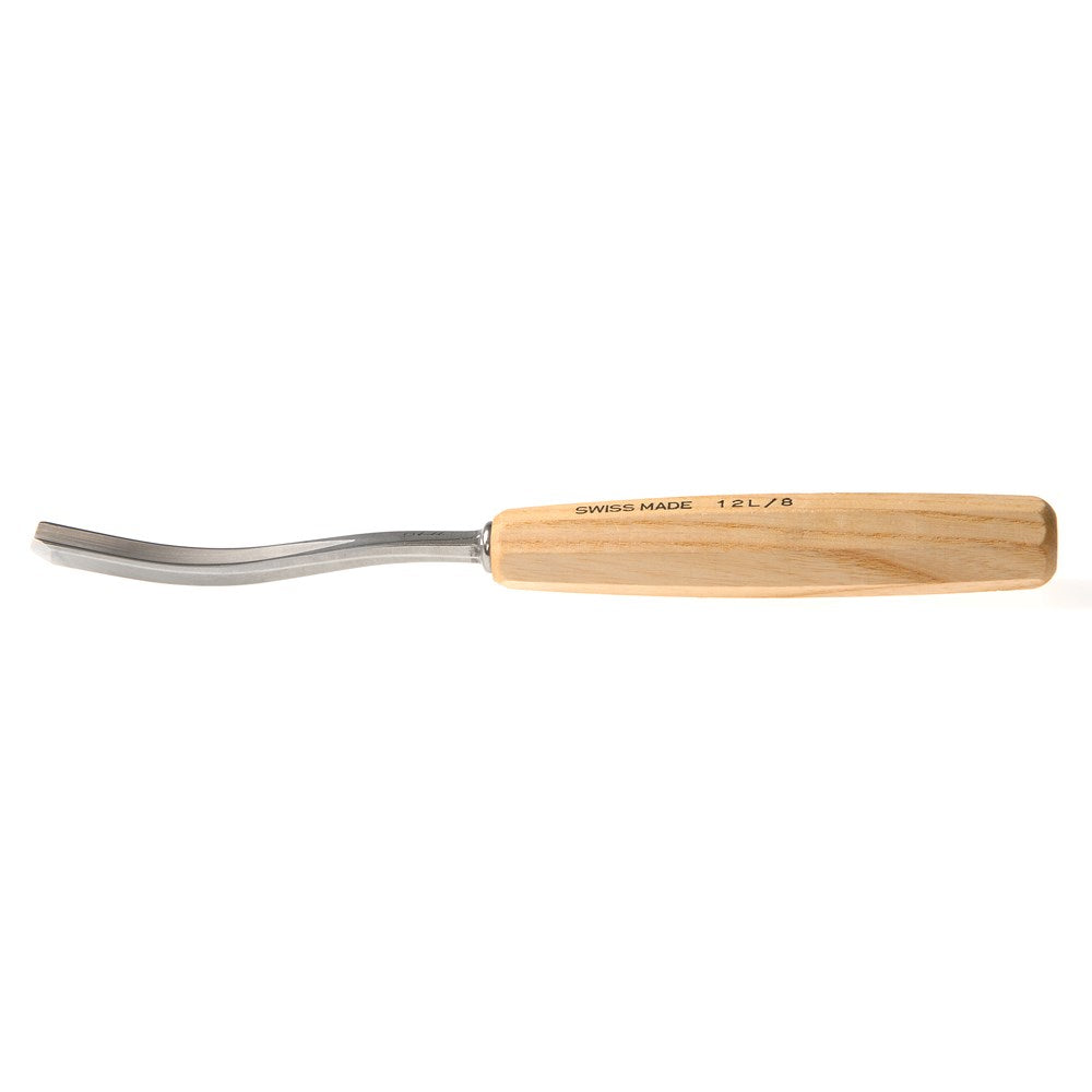 The Number 12L longbent chisels have a gradually curved shank, and 60° V shaped profile for shaping recesses and working in corners.