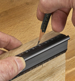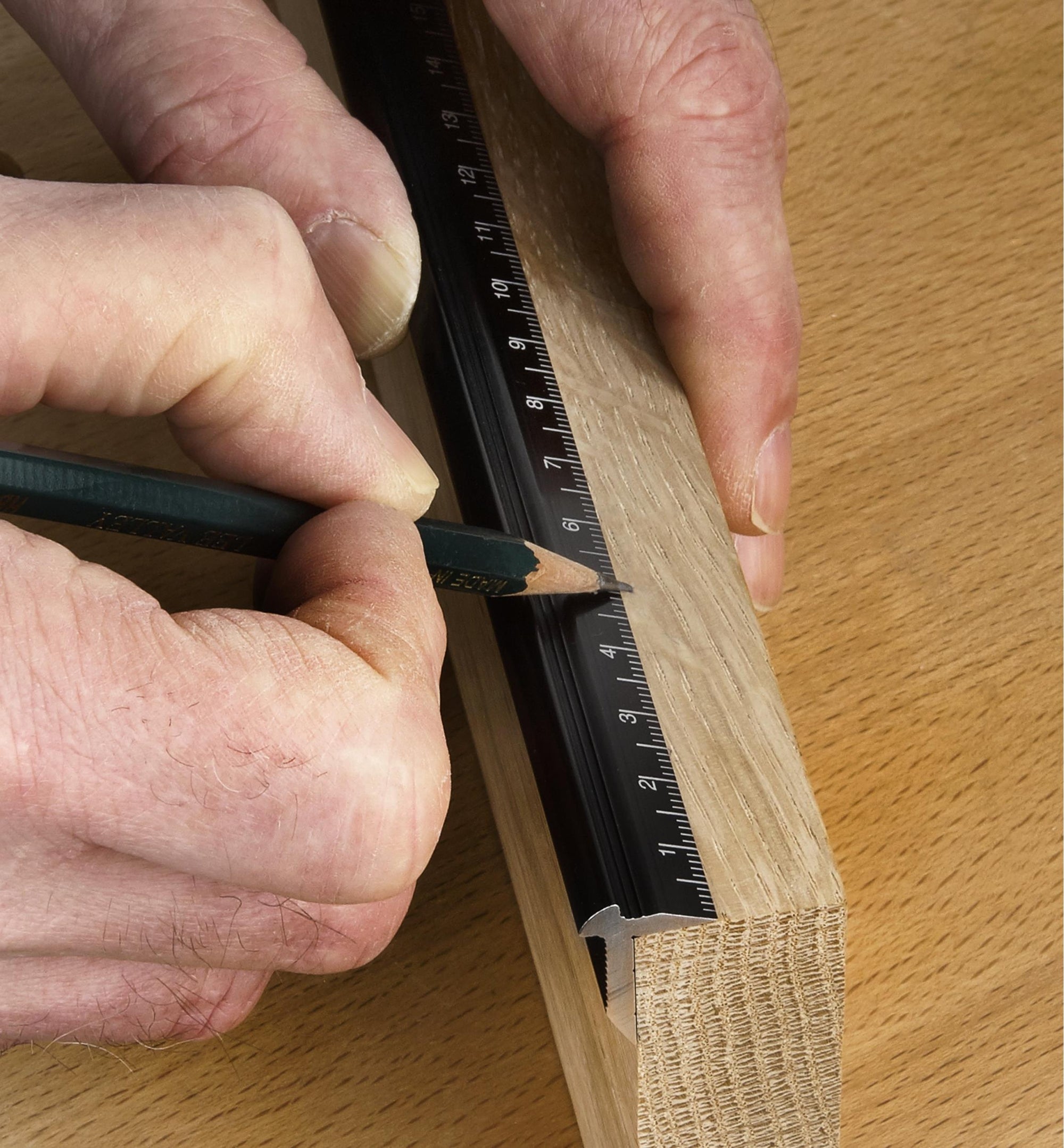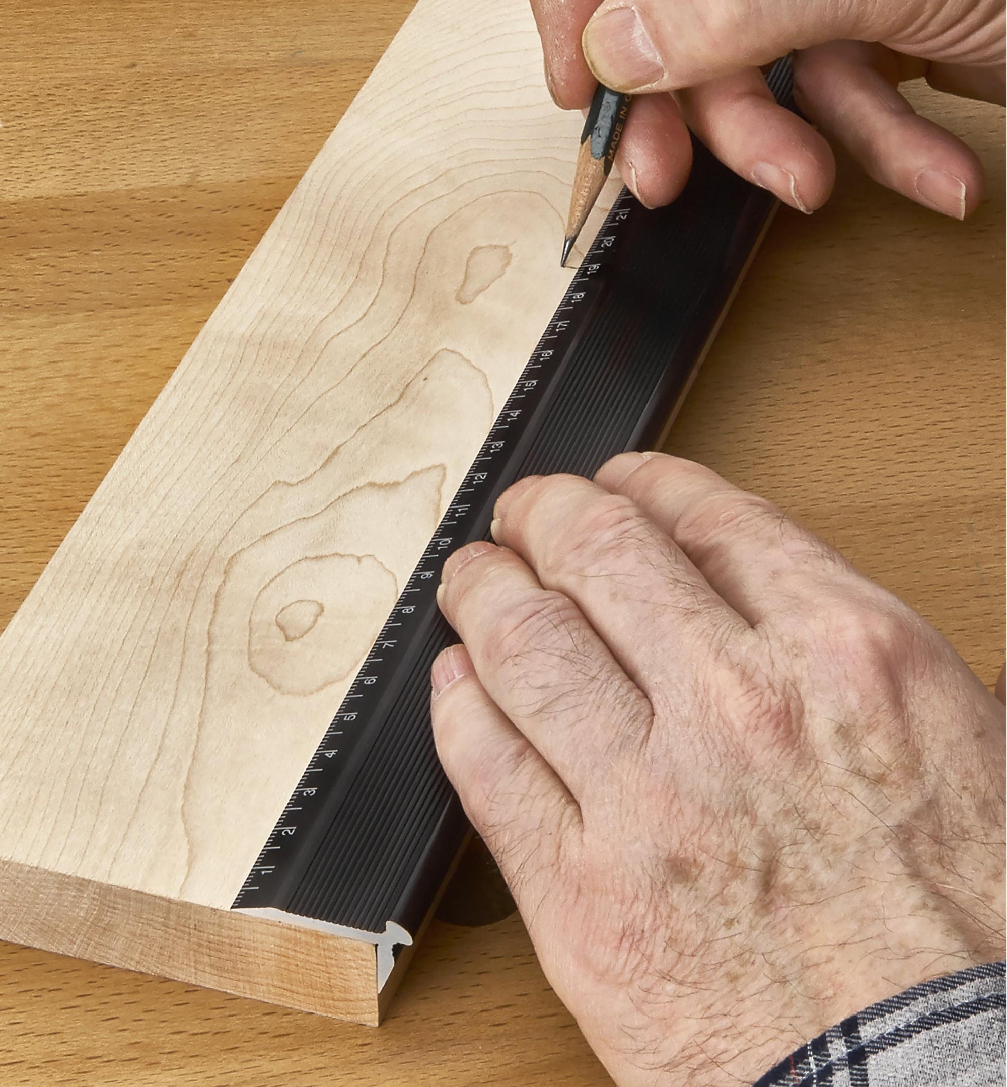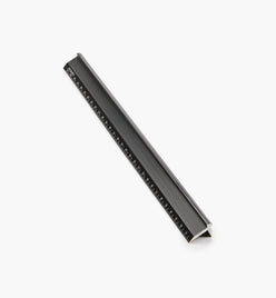 These Veritas rules have an acute interior angle to ensure that they seat well, even over saw whiskers, and bevelled edges with etched graduations to minimize parallax errors. The great advantage of this style of rule is that it saddles the edge of a workpiece, making it easy to hold accurately in position when measuring and marking layout lines. This design also simplifies transfer of perpendicular lines from face to edge and is particularly convenient when holding and marking off dowel rod stock.