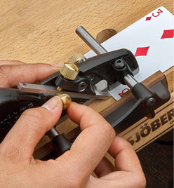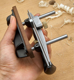 Just shy of 138mm (5 1/2″) long, the ductile cast iron body is accurately machined with a 45 deg blade bed. The body has been sculpted to fit the hand for comfort, and the plane can be used with one hand if necessary. The 127mm (5″) long fence registers solidly to the workpiece and is through-drilled to accommodate the addition of a wooden fence extension. The double guide rods prevent the fence from racking. The depth stop controls the depth of the groove or rabbet (maximum 9.5mm (3/8") deep); it is secured directly by a brass knob and has relieved edges to avoid marking your work.