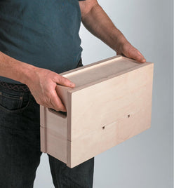 Made in Canada from Baltic birch plywood, the box is about 14 1/2” × 5” × 9” and has hand-holds on either end.