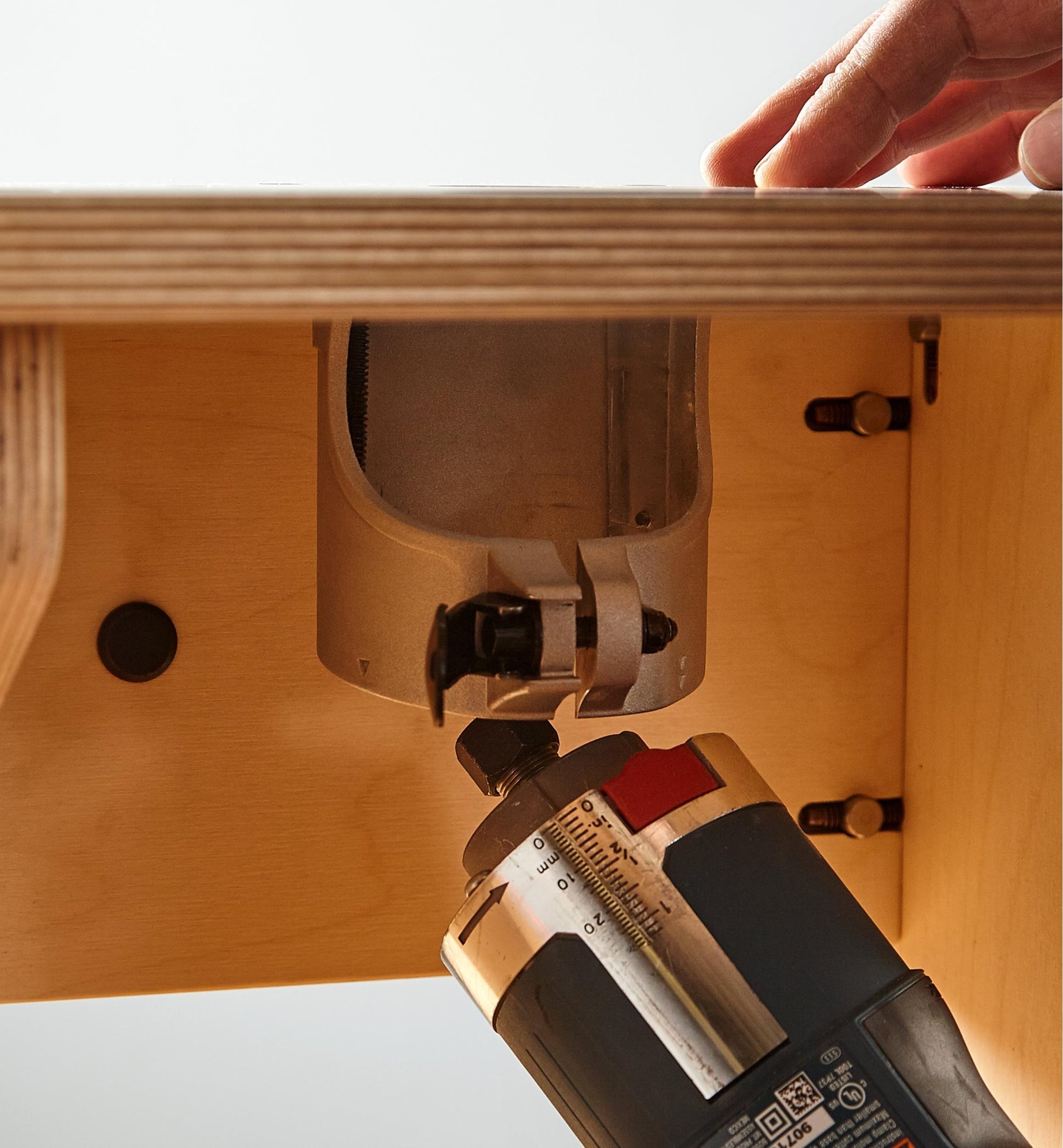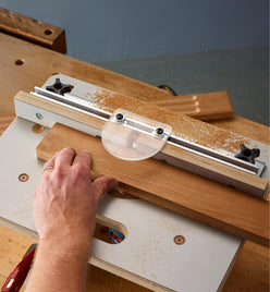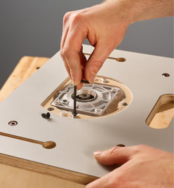 The sturdy 390mm × 290mm table top is milled from 18mm Baltic birch plywood and has a low-friction laminate surface. Designed to accept the Veritas Compact Router Base Plates (offered separately), it has five levelling screws built into the table to ensure you can fine-tune the base plate height so it sits dead flush with the table surface. Two of the levelling screws also serve as insert nuts, accepting the two mounting bolts used to attach the base plate to the table. One of those mounting screws can be replaced with the pivot post (provided) for routing curves without the fence.