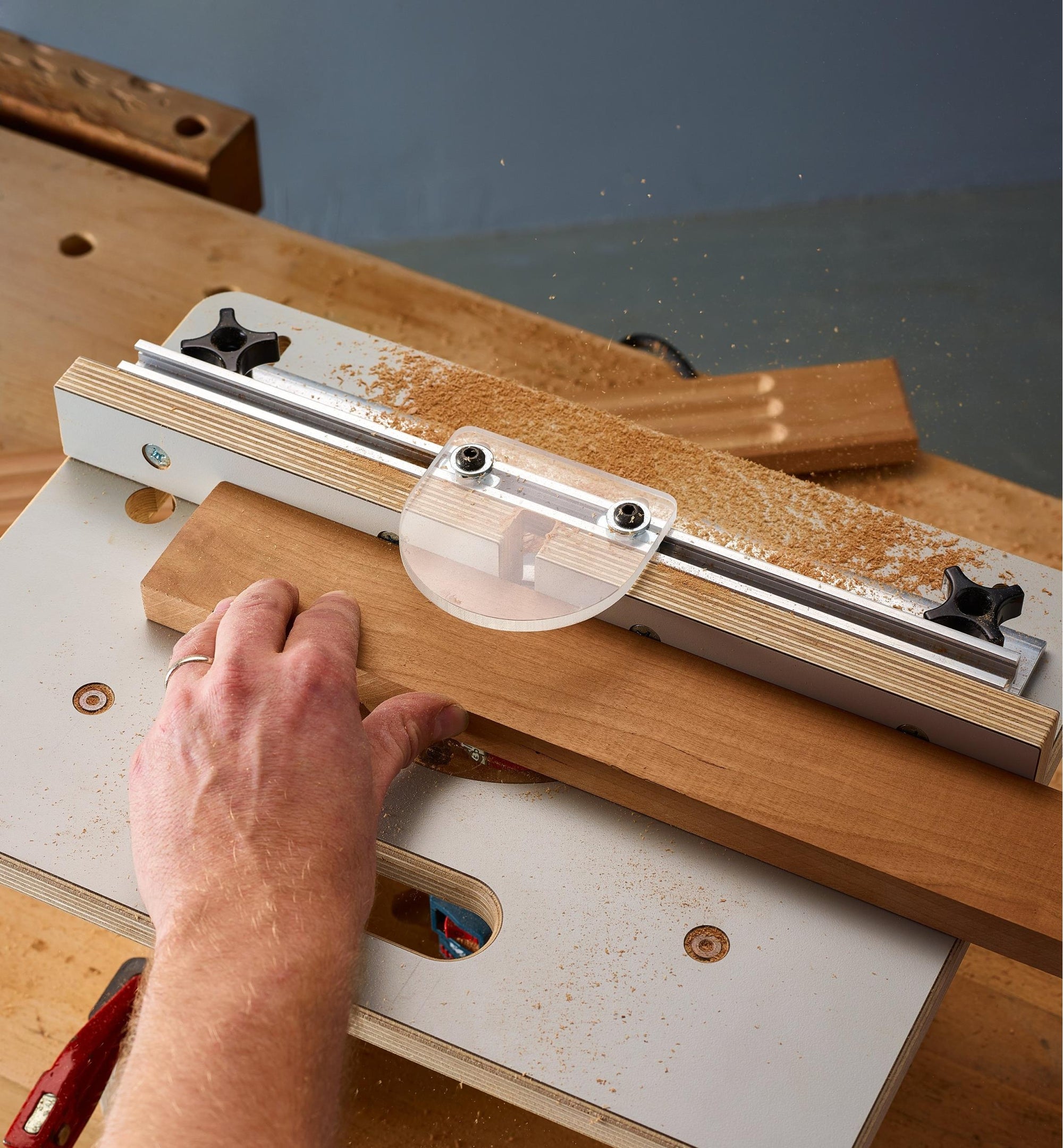 The 14" machined aluminum fence has a pair of laminate-clad sub-fences (each 190mm long) that can be adjusted to accommodate bit profiles for zero-clearance routing; integral top and face T-slot tracks can be used for mounting jigs and accessories, such as the included clear acrylic safety shield.