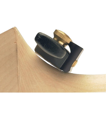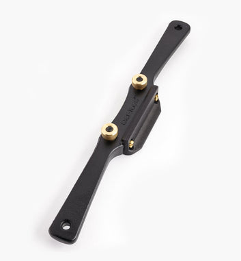 This spokeshave has the same low cutting angle as spokeshaves of old (20° basic bevel with a 25° micro-bevel), but adjustment of cutting depth has been simplified substantially. Instead of adjusting blade projection, the blade is fixed, forming the sole of the spokeshave, while the adjustable toe piece controls the depth of cut. In one orientation, the toe piece is suited to convex and flat work; flipped 180°, it is set for concave work. The blade is fixed by two machine screws that wedge it in position when the knurled knobs on the top of the shave are tightened. Because the blade can be moved forward or backward, the mouth opening is controllable.