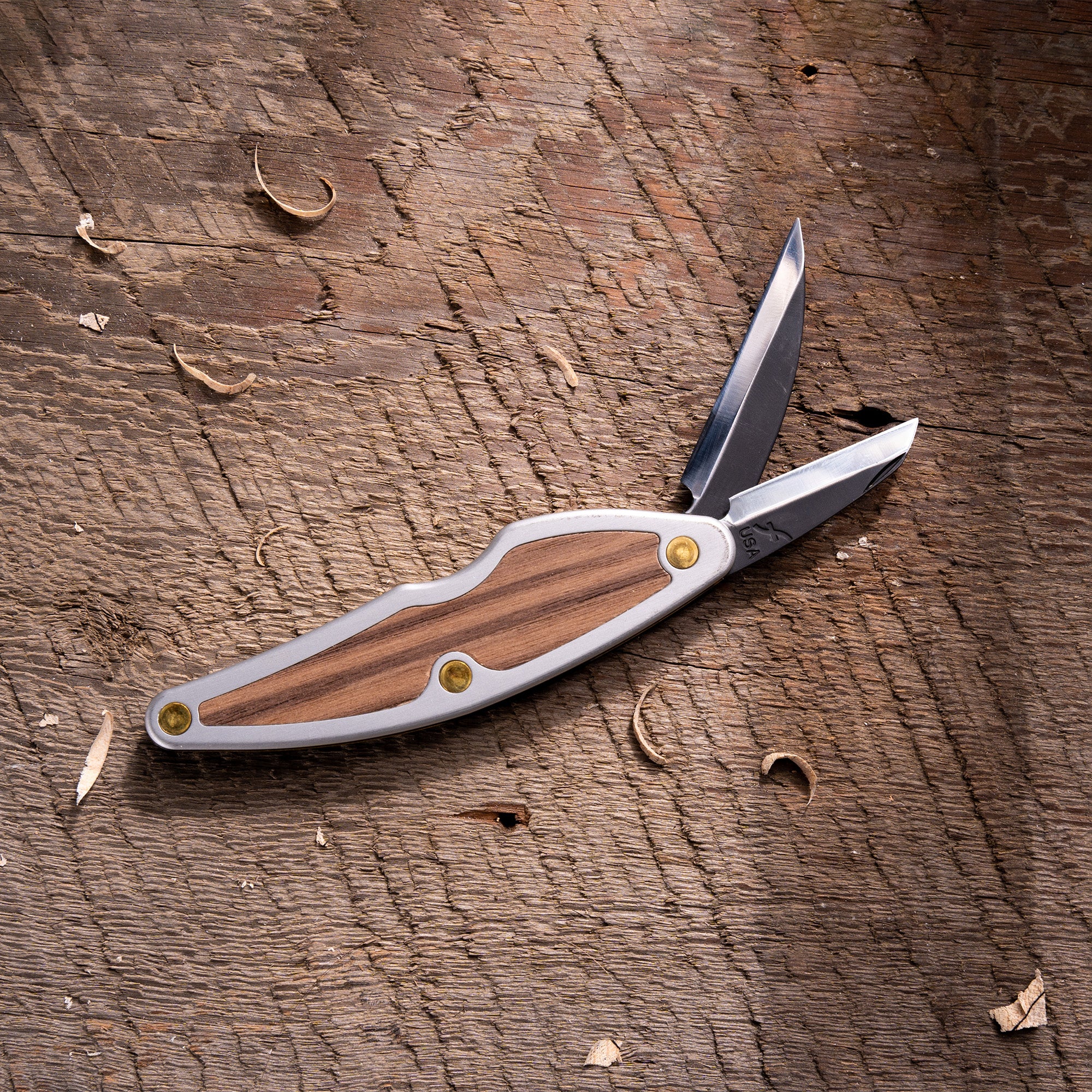 A recent addition to Flexcut's Carvin' Jack family of folding multi-tools, this knife features a Detail Knife and Roughing Knife yet weighs in at only 85g. It's just over 10cm long when closed, so it neatly fits in your pocket - ideal for travelling.