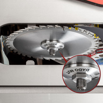 Dado Nut merges the arbor washer and arbor nut into one integrated unit. The threads extend almost completely through the arbor washer, and the nut is conveniently retained within the washer. Now you have the stability of a carefully machined arbor washer AND full thread engagement of the arbor nut when using a full dado stack.
